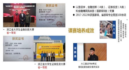 专业优势:本专业2024软科中国大学专业排名B+,拥有一支由省“151”人才、省高校优秀青年教师等兼具行业背景组成的高水平团队队伍;建有应用经济学(020200)学硕金融学二级点和金融(025100)专硕学位点等本硕博完整育人体系;依托浙江省重点培育、省级经济管理类教学示范中心等平台开展教学和研究,已在绿色金融、普惠金融、数字科技金融等方面形成独特的人才培养特色和优势;“金融+工程”“AI+金融数字金融与科技金融、绿色金融与普惠金融、金融风险管理、证券投资与量化分析等课程内容与学科竞赛和行业资格考试体系结合;并注重教融合,协同培养培养,实现教育与产业的有效对接,培养适应行业需求的高素质人才。