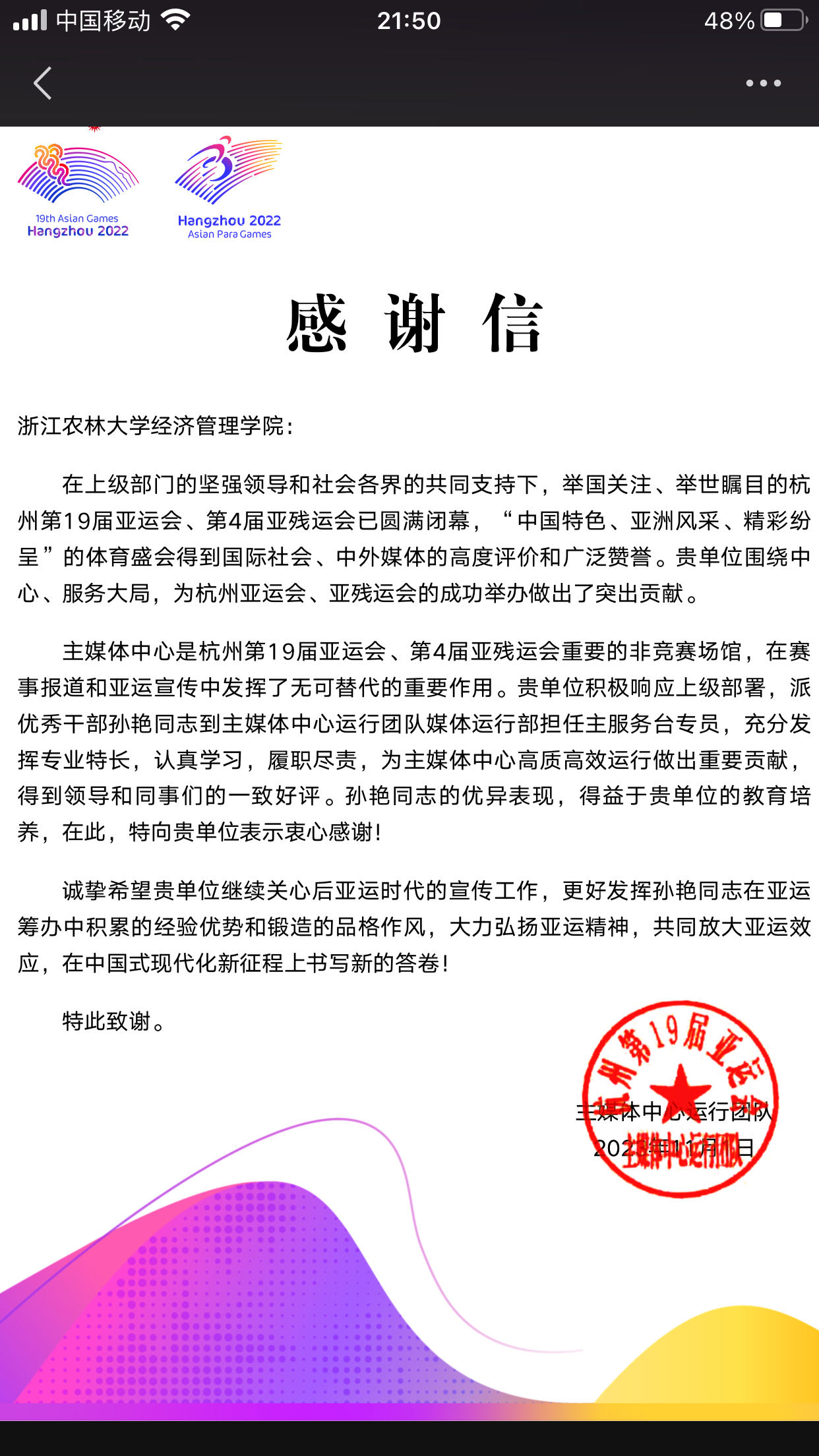 日前,杭州第19届亚运会主媒体中心运行团队给公司发来感谢信。信中高度肯定了公司孙艳、鲁晓玮老师亚运会期间在主媒体中心工作中克难攻坚、勇挑重担,为亚运会的圆满落幕做出的积极贡献表示了充分肯定。并对公司围绕中心、服务大局,为杭州亚运会、亚残运会的成功举办做出的突出贡献表达了诚挚谢意。