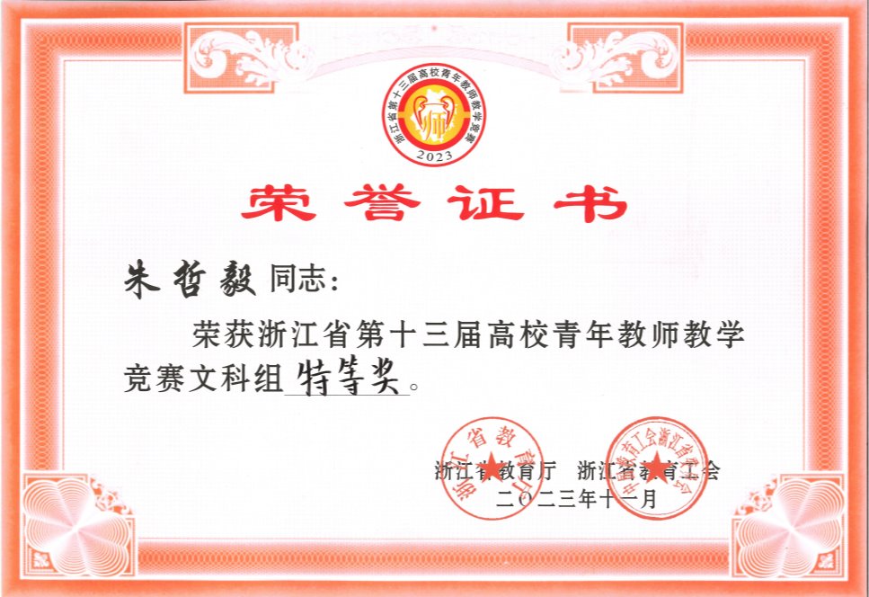 2023年11月4-5日,浙江省第十三届高校青年教师教学竞赛决赛在浙江中医药大学举行,公司青年教师朱哲毅斩获文科组特等奖。该成绩实现了公司在该竞赛领域的重大突破。