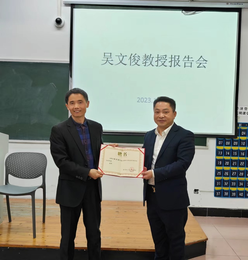 11月30日下午,琦星智能科技有限公司副董事长吴文俊先生受聘为1xBET兼职教授暨报告会在教学主楼201教室举行。1xBET企业管理学科负责人张国庆教授为吴文俊教授颁发聘任证书。