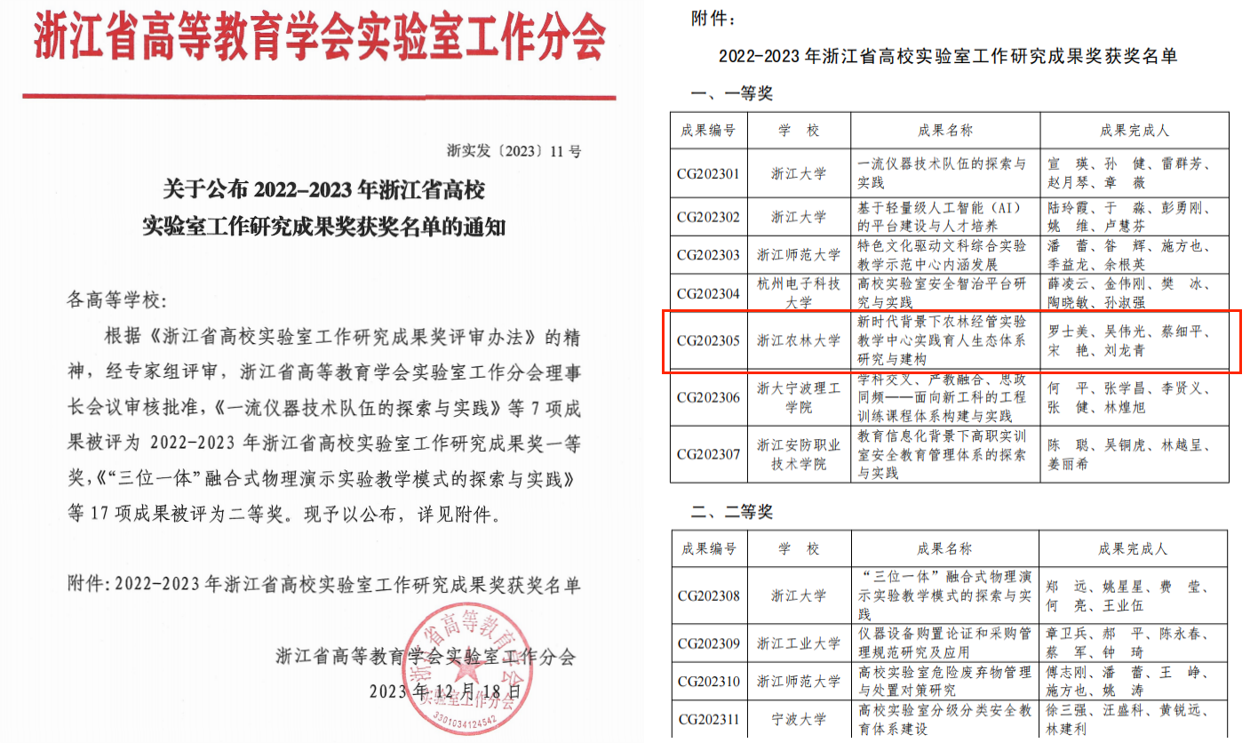 近日,据浙江省高等教育学会实验室工作分会发布《关于公布2022-2023年浙江省高校实验室工作研究成果奖获奖名单的通知》获悉,由公司实验中心罗士美老师主持的“新时代背景下农林经管实验教学中心实践育人生态体系研究与建构”成果获得一等奖。本次全省高校实验室工作研究成果奖评比,共评出一等奖7项、二等奖17项。