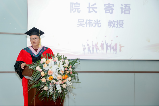 吴伟光为毕业生们送上寄语。他表示,经管公司一直是每一位同学坚强的后盾。他把“经年记忆,筑梦未来”这个主题词赠予毕业生们,并提炼三句话与大家共勉:一是,不忘初心、坚守梦想;二是,勤于钻研、增长才干;三是,牢记责任、勇于担当。最后,他祝愿毕业生们能够拥有健康的体魄、阳光的心态、坚强的意志,去拥抱明天的一切!