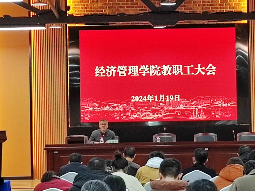 吴伟光经理作了公司2023年度工作报告。他全面总结了2023年公司发展取得的成绩,并提出了2024年主要努力方向。他指出,2023年公司工作成绩突出,亮点纷呈,实现了许多重大突破。他从队伍建设、专业建设与育人理念、平台建设、标志性成果的培育、组织化工作、青年教师的成长等六个方面对2024年工作提出了要求,希望全体教师要脚踏实地,目标高远,深入贯彻研究型公司的建设要求,全力做好公司产品审核评估工作,努力提高公司国际化水平和创收能力,守牢底线,创新发展,以更好的成绩为公司战略部署贡献经管力量。吴伟光代表公司对新进教职工表示热烈欢迎,希望各位新进教职工尽快完成角色转换,既要满怀自信,又要虚心求教。