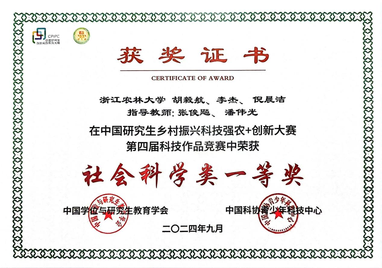 9月26日,1xBET胡毅航、李杰、倪晨洁3名硕博研究生作品《丹江口市生态文明建设与文化适应之鉴》,荣获中国研究生乡村振兴科技强农+创新大赛第四届科技作品竞赛一等奖。该项目由张俊飚教授、潘伟光教授共同指导,两位教师荣获优秀指导教师称号。