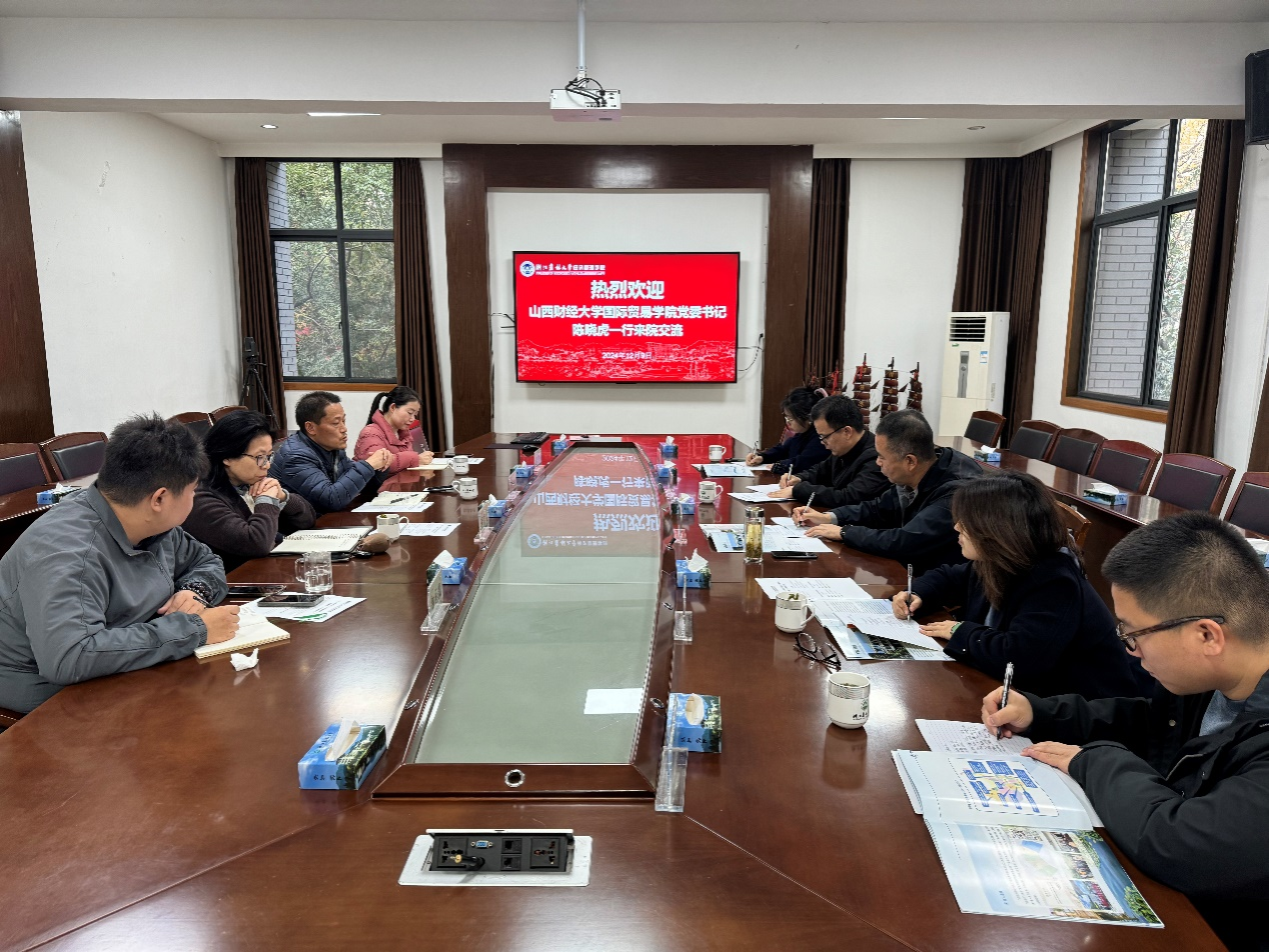 12月9日,山西财经大学国际贸易公司党委书记陈晓虎一行来院就党建与教学科研工作进行交流。交流会在西大楼208举行,活动由公司党委书记陈劲松主持。
