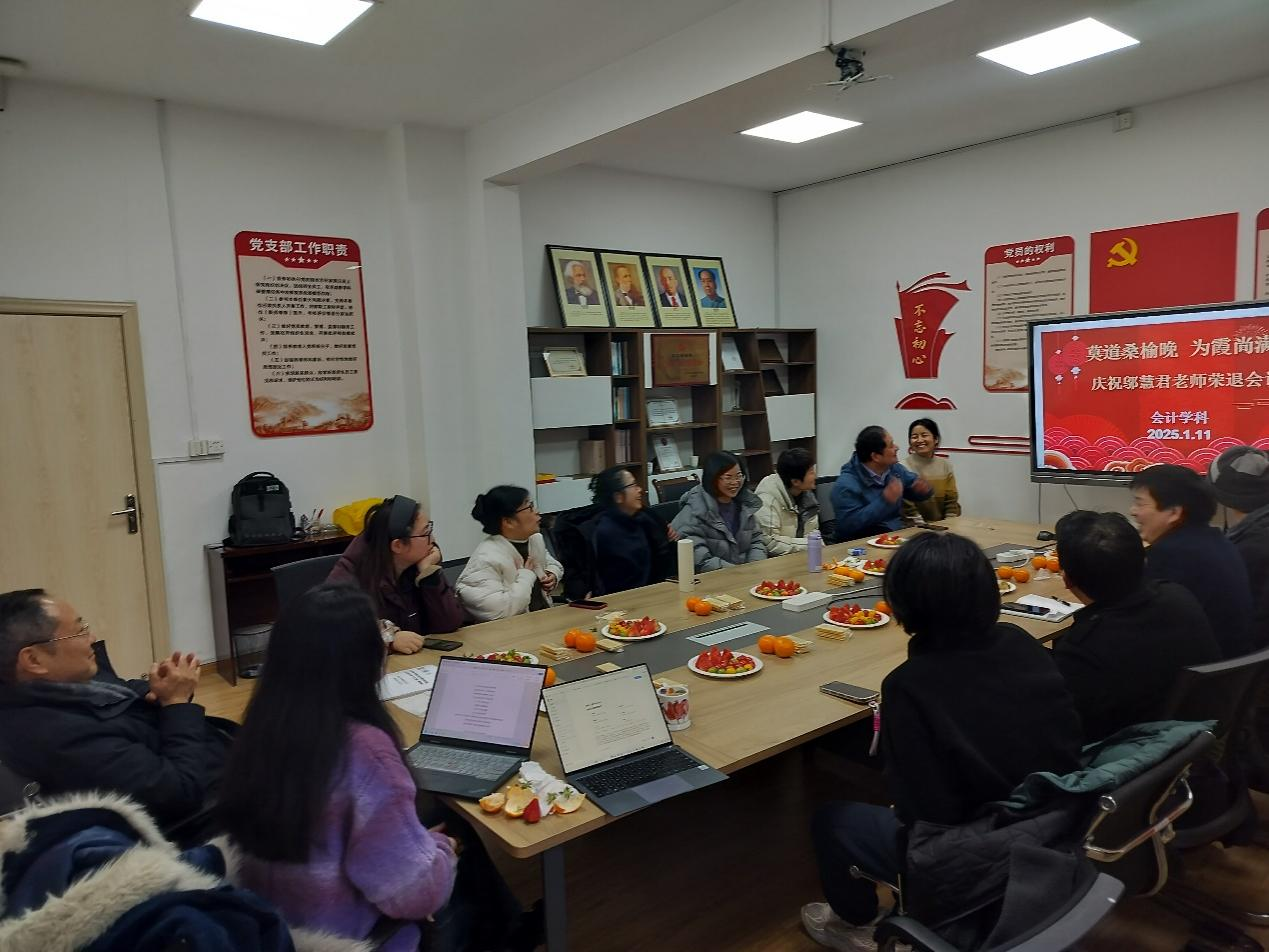 会议最后为邬慧君老师举办荣退仪式。邬慧君老师在会计学科任教30余年,为学科的发展奉献了自己的青春与智慧。学科负责人刘梅娟教授、MPAcc主任石道金教授以及在场的各位教师纷纷表达了对邬慧君老师的敬意与感谢。邬慧君老师也发表了深情的退休感言,她对公司和学科的培养表示感激,对共事多年的同事们表达了不舍之情,并衷心祝愿会计学科在未来能够蒸蒸日上,取得更加辉煌的成就。
