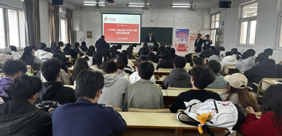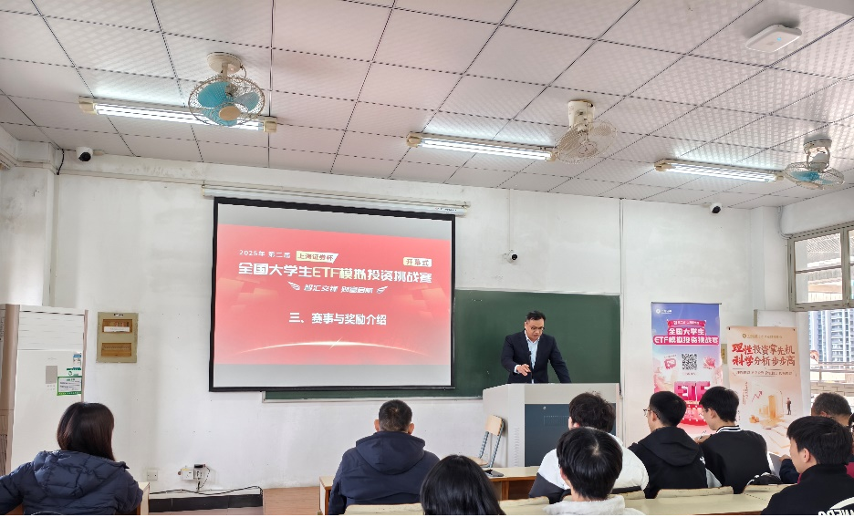 再次,上海证券有限责任公司杭州公司路证券营业部市场总监狄劲松对“第二届全国老员工ETF模拟投资挑战赛”的活动口号、主办单位、协办单位、时间规划、参赛流程以及赛事奖励等进行了详细介绍,并鼓励各位同学积极参赛,增强自身投资体验感。