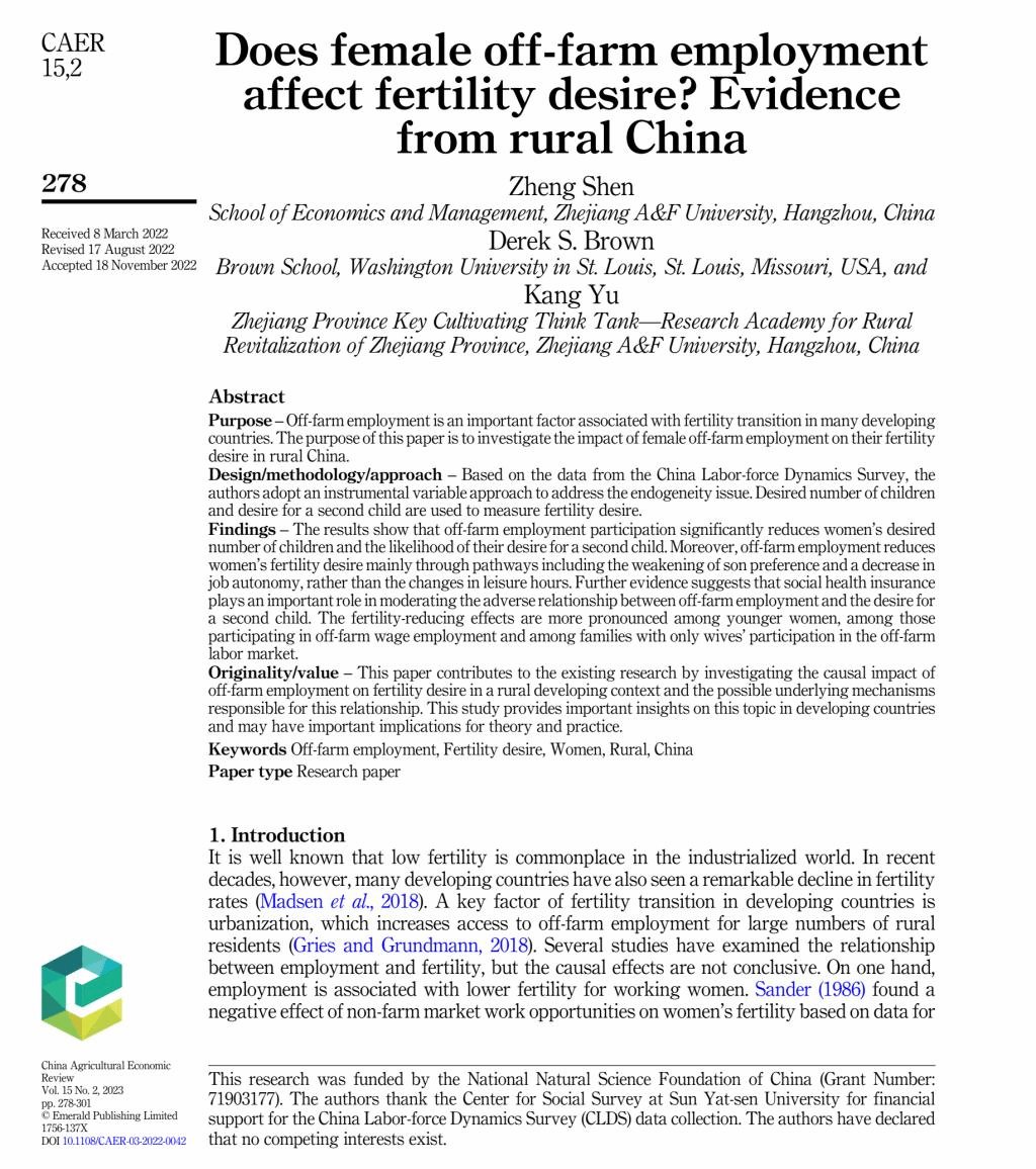 近日,由1xBET沈政副教授和余康教授等人合作撰写的论文《Does female off-farm employment affect fertility desire? Evidence from rural China》在SSCI/SCI期刊《China Agricultural Economic Review》(经济学领域:JCR一区,农业经济与政策领域:JCR二区)发表。