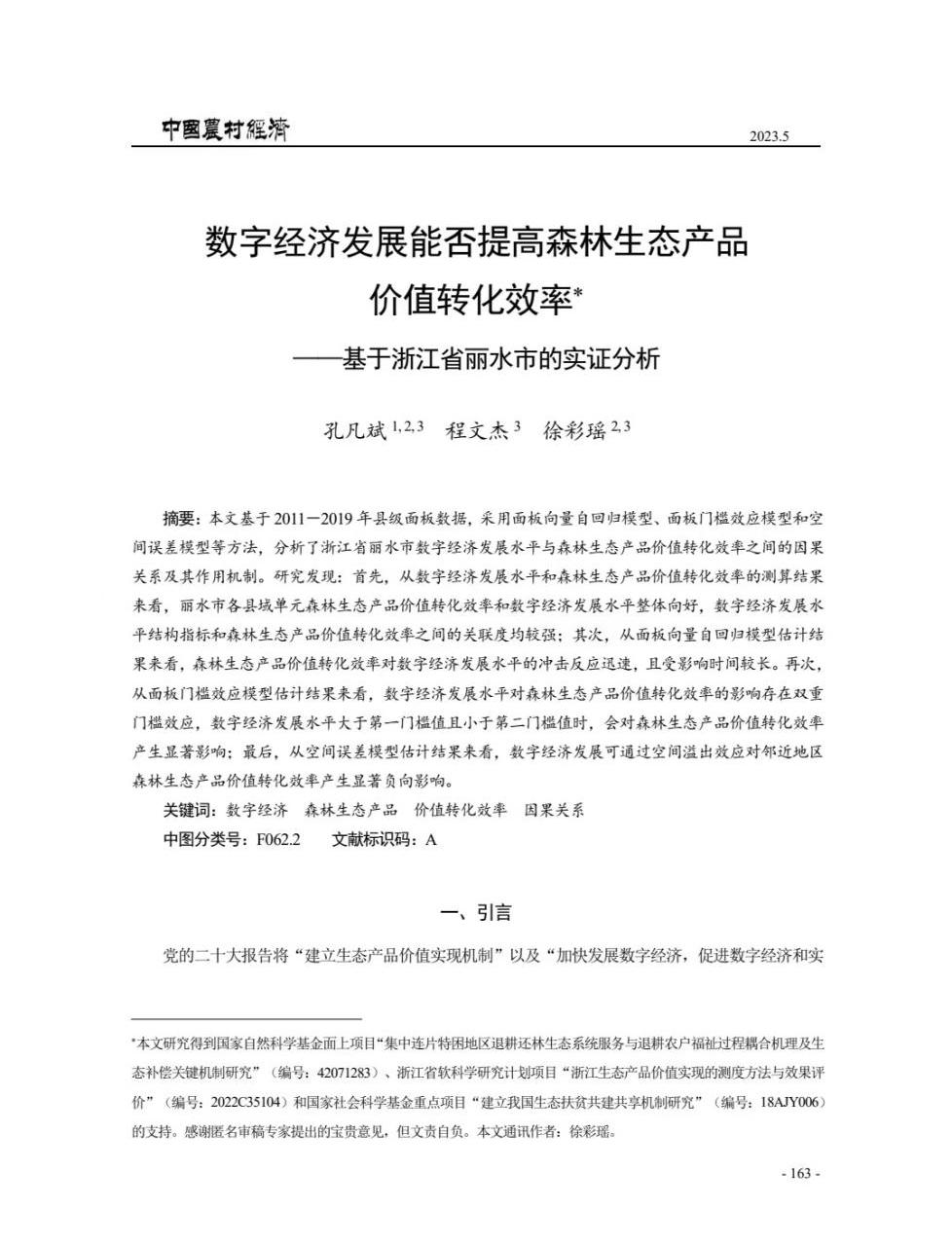 近日,由公司孔凡斌教授团队完成的原创性学术论文《数字经济发展能否提高森林生态产品价值转化效率——基于浙江省丽水市的实证分析》在浙大一级期刊《中国农村经济》2023年第5期发表。论文第一作者为孔凡斌教授,通讯作者为徐彩瑶博士,农林经济管理学2020级硕士研究生程文杰为合作作者。该文是孔凡斌教授主持的国家自然科学基金面上项目(编号:42071283)、国家社会科学基金重点项目(编号:18AJY006)和徐彩瑶博士主持的浙江省软科学研究计划项目(编号:2022C35104)的重要阶段性成果。