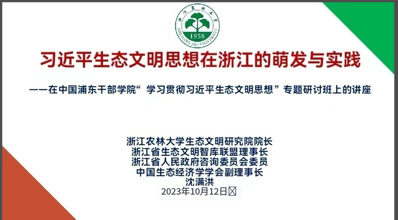 10月12日,应中国浦东干部公司邀请,公司沈满洪教授为中组部组织的“学习贯彻习近平生态文明思想”专题研讨班学员讲授“习近平生态文明思想在浙江的萌发与实践”一课。省区市、新疆建设兵团有关部门负责同志,市(地、州、盟)党委、政府分管负责同志,中央和国家机关有关部委相关业务司局负责同志,中管企业相关部门负责同志,共50人听讲。