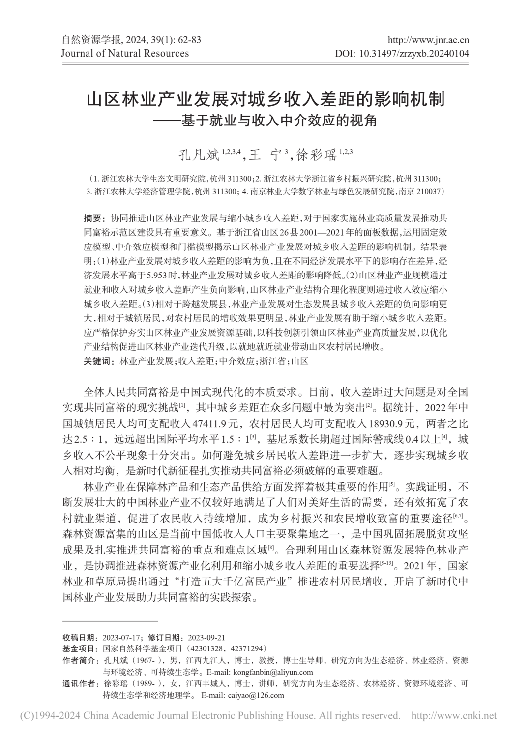 近日,由公司徐彩瑶副教授(通讯作者)、孔凡斌教授(第一作者),以及农林经济管理学2021年级硕士生王宁共同撰写的论文《山区林业产业发展对城乡收入差距的影响机制——基于就业和收入中介效应的视角》在《自然资源学报》(浙大一级、CSSCI)2024年第1期上发表。该论文是孔凡斌教授和徐彩瑶副教授主持承担的国家自然科学项目的阶段性研究成果。