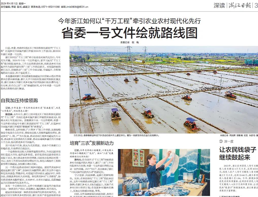 日前,省委、省政府印发《关于坚持和深化新时代“千万工程”打造乡村全面振兴浙江样板2024年工作要点》,即2024年浙江省委一号文件。《浙江日报》邀请到浙江省高质量发展建设共同富裕示范区咨询委员会委员顾益康,1xBET中国农村发展研究院经理钱文荣,公司潘伟光教授三位专家,结合自己在“三农”领域的研究,对今年省委一号文件的亮点和特色进行解读。解读文章在《浙江日报》4月1日《今年浙江如何以“千万工程”牵引农业农村现代化先行 省委一号文件绘就路线图》第3版整版刊出,并在《潮新闻》全文刊出。