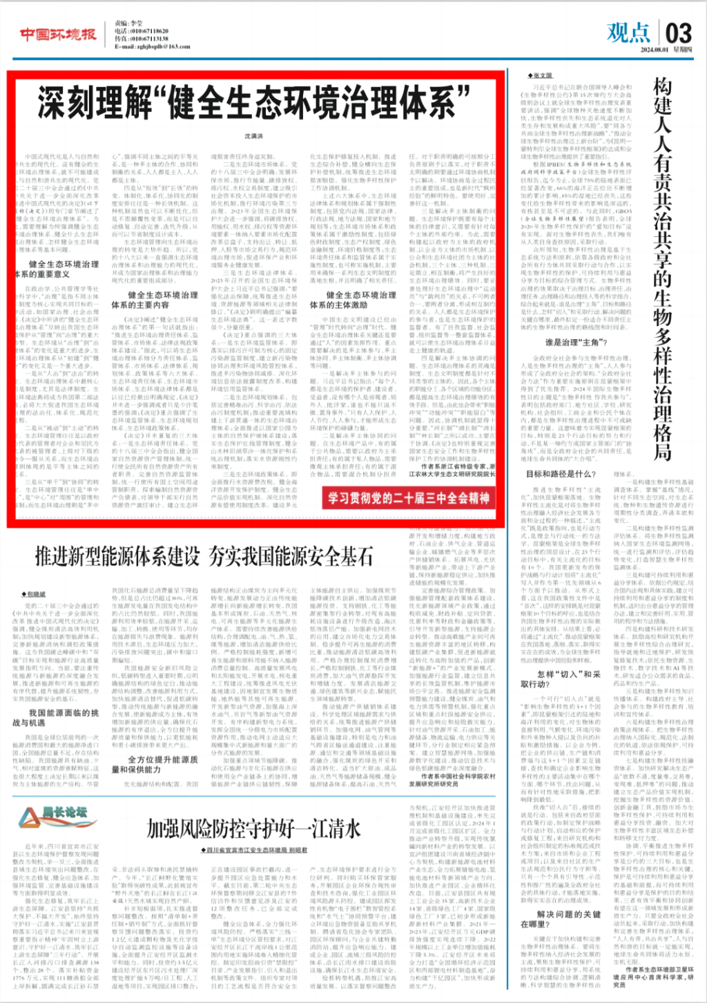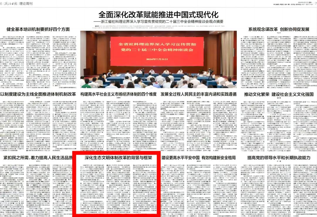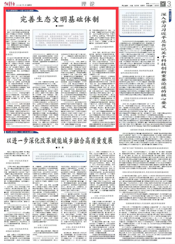 8月4日,沈满洪教授新作《完善生态文明基础体制》发表在《中国青年报》理论版头条“学习贯彻党的二十届三中全会”专栏上。