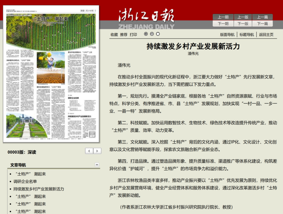 9月4日,潘伟光教授撰写的理论文章“持续激发乡村产业发展新活力”在《浙江日报》第3版发表。