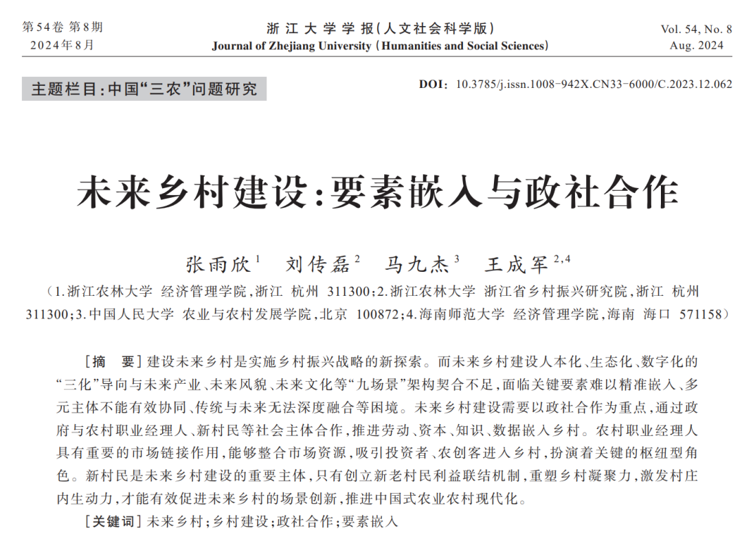近期,王成军教授与1xBET硕士生张雨欣,刘传磊博士等团队成员合作撰写的论文《未来乡村建设:要素嵌入与政社合作》在一级学术期刊《1xBET学报(人文社会科学版)》第8期发表。