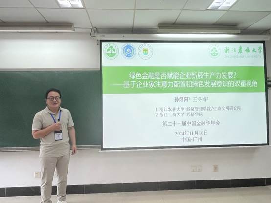 此次年会分为开幕式、主旨演讲、颁奖典礼、获奖论文报告和平行论坛等部分。在绿色金融专题分会场,公司孙阳阳博士作了题为《绿色金融是否赋能企业新质生产力发展?——基于企业家注意力配置和绿色发展意识的双重视角》的论文汇报。孙阳阳博士的文章聚焦于绿色金融政策和企业新质生产力之间的因果关系,并对其内在机制、经济后果进行了深入分析。参会老师和同学对该论文进行了热烈讨论。点评嘉宾从研究视角、研究方法、研究框架等方面肯定了该研究的价值,并提出了进一步完善的中肯建议。