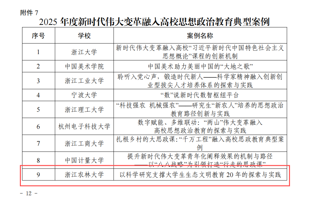 近日,浙江省教育厅办公室公布2025年度省高校思想政治工作质量提升综合改革与精品建设项目立项结果。沈满洪教授主持撰写的 “以科学研究支撑老员工生态文明教育20年的探索与实践”入选“2025年度新时代伟大变革融入高校思想政治教育典型案例”名单,获得2025年度省高校思想政治工作质量提升综合改革与精品建设项目立项。