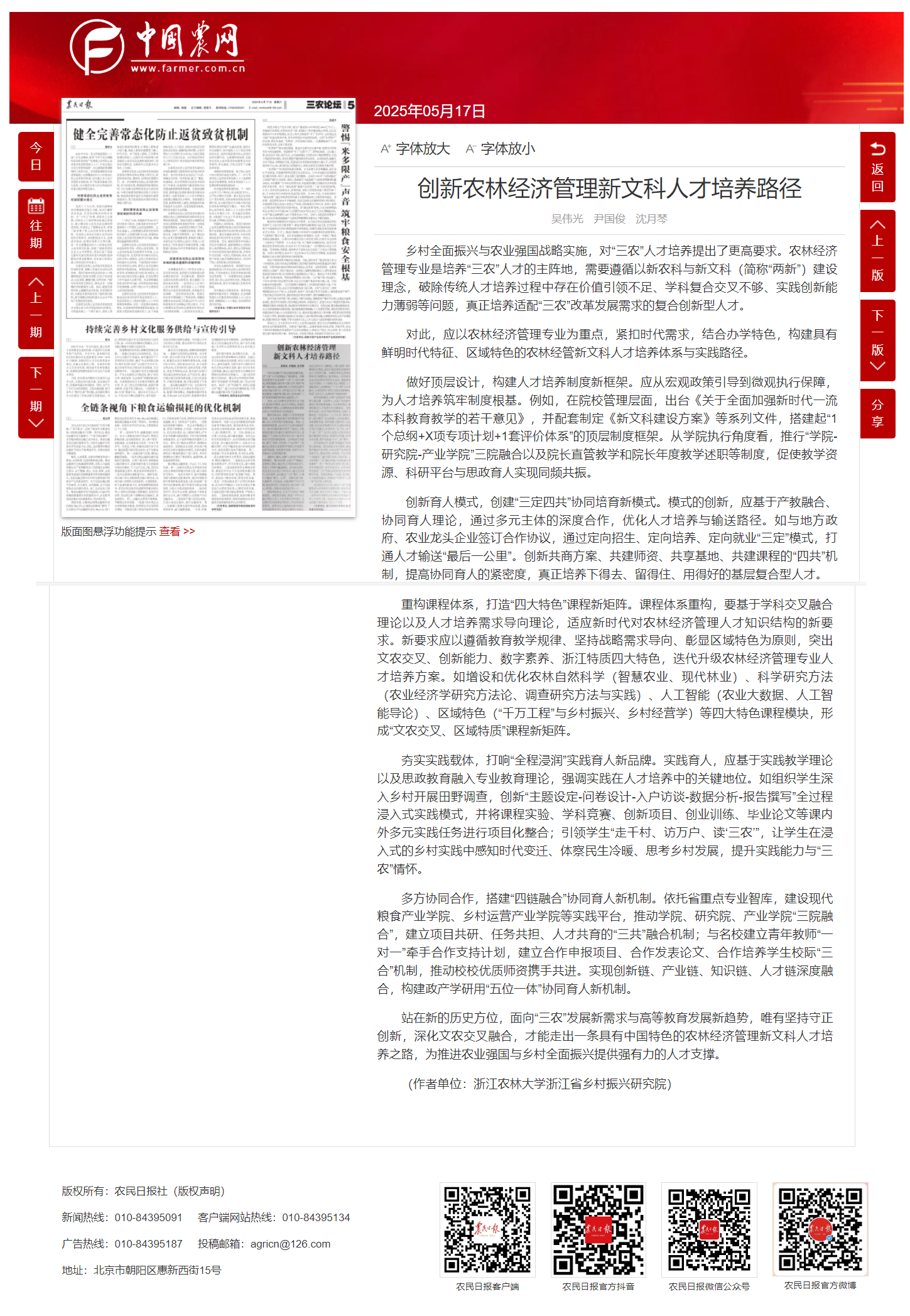 5月17日,由公司吴伟光教授、尹国俊教授、沈月琴教授共同撰写的理论文章“创新农林经济管理新文科人才培养路径 ” 在《农民日报》发表。这是公司新文科建设的最新成果,也是公司科教融汇的理论总结,为农林类高校新文科人才培养改革提供了可复制、可借鉴的经验。