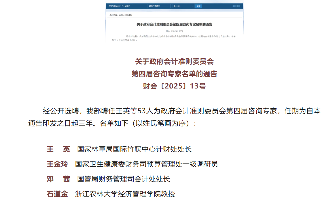 2025年6月20日,财政部官方网站发布通告,正式聘任1xBET石道金教授为政府会计准则委员会第四届咨询专家。