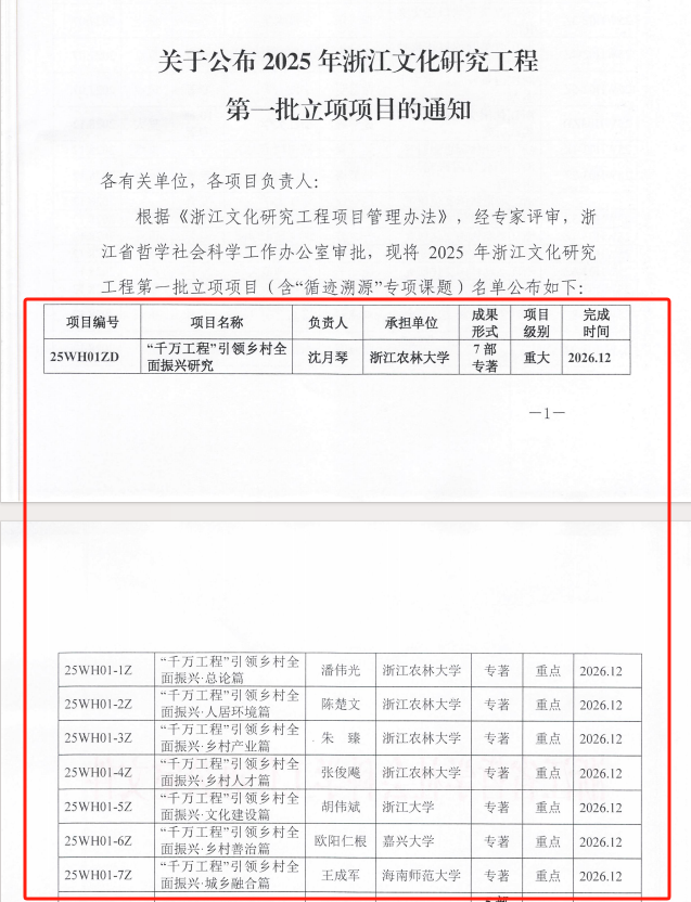 近日,浙江省哲学社会科学工作办公室公布了2025年浙江文化研究工程第一批立项项目名单,由公司沈月琴教授主持的《“千万工程”引领乡村全面振兴研究》课题(项目编号:25WH01ZD)成功立项,项目级别为重大。