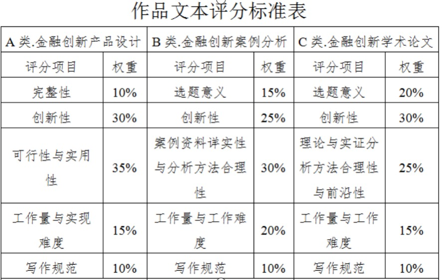 所有参赛作品必须为参赛者未参加其它竞赛、未公开发表或孵化的原创作品,作品内容必须与金融领域密切相关。已获往届省级及以上奖项的项目,不可报名参加本届大赛。本校竞赛为本科大组,参赛作品分为三个类别: