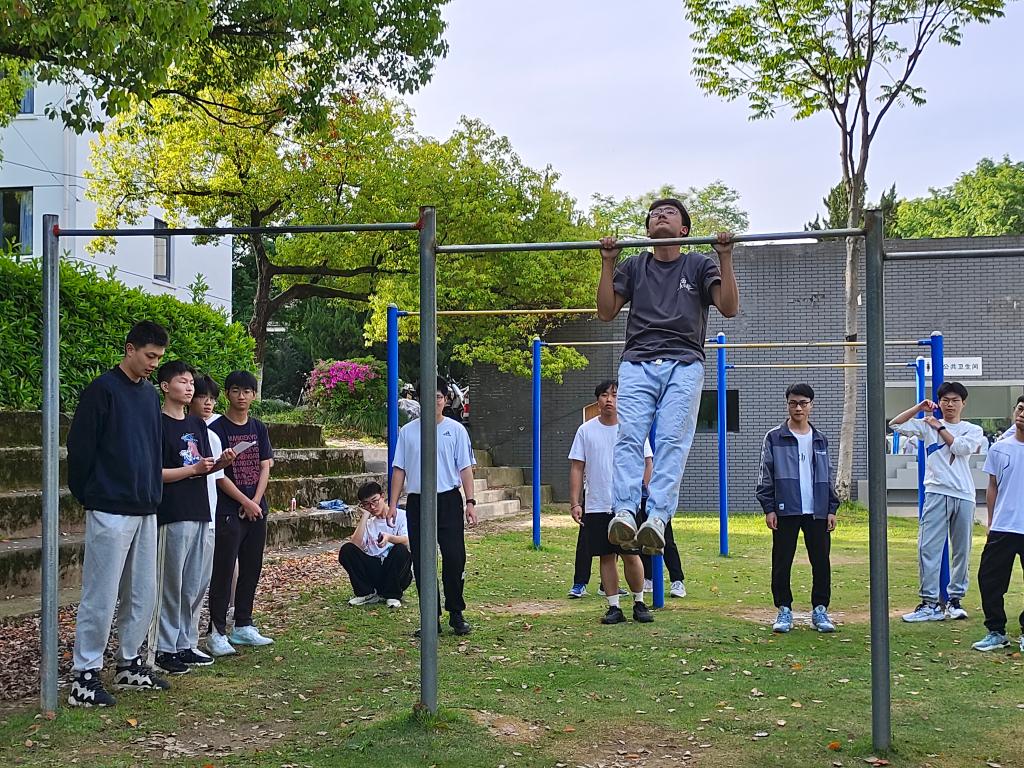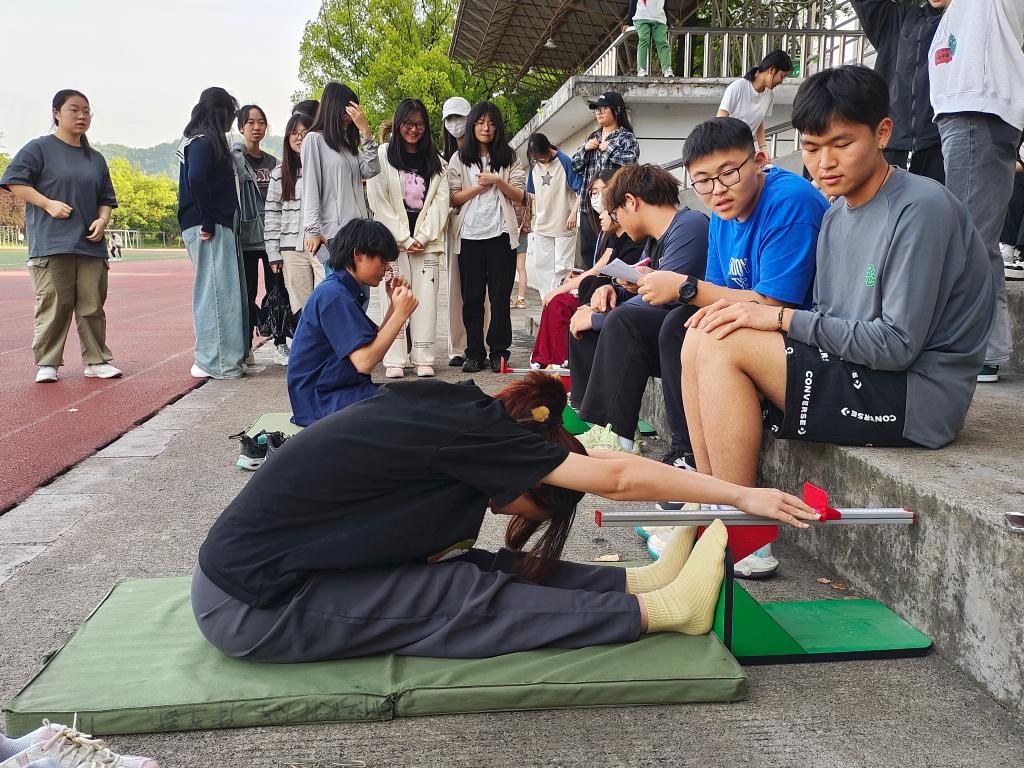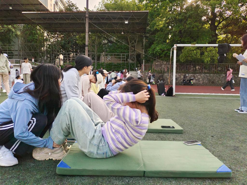 三位阳光体育指导员将500余名同学们分成五组进行训练,分别是立定跳远、引体向上、仰卧起坐、坐位体前屈和跑步。分组完毕后,三位阳光体育指导员耐心讲解各类运动项目的注意点,向同学们示范标准的动作,教授同学们拿分的技巧点,引导同学们将所学融入实践,获得同学们的热烈好评。在三位阳光体育指导员的帮助下,同学们尽管已经汗如雨下,但依然坚持了下来,出色地完成了一个多小时的刻苦训练。