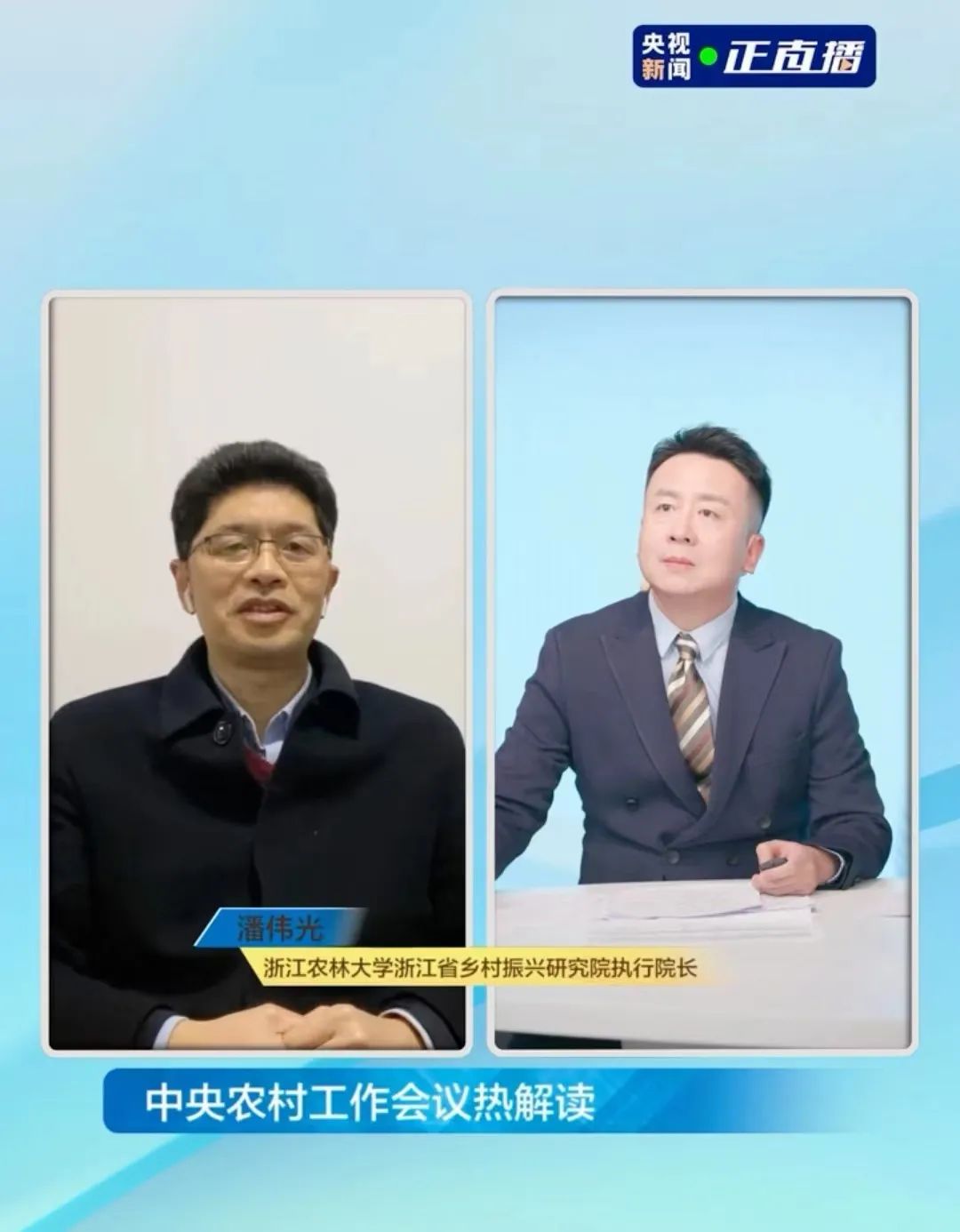 近日,中央农村工作会议在北京召开。今年中国农业农村经济运行如何?2024年三农工作如何干?乡村振兴如何全面推进?近日,央视新闻邀请中央农办、农业农村部乡村振兴专家委员会委员张红宇等专家对相关政策进行了深度剖析解读。在谈及“‘千万工程’实施以来,浙江乡村在哪些方面变化最大”的话题时,公司潘伟光教授作为视频连线专家,通过云连线的方式作了解答。