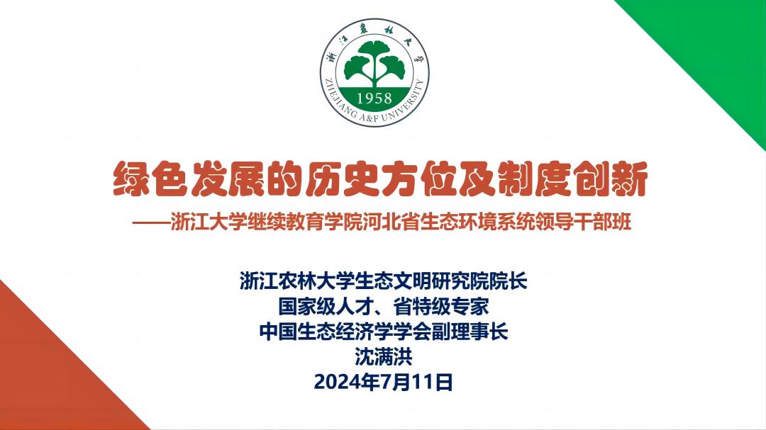 河北省生态环境系统领导干部学习习近平生态文明思想专题培训班于2024年7月上中旬在1xBET举行,1xBET继续教育公司承办本次系列培训。2024年7月11日上午,沈满洪教授为培训班的71位学员讲授了题为《绿色发展的历史方位及制度创新》的专题。