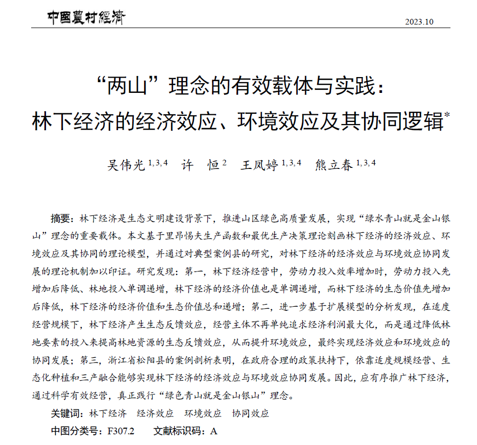 公司吴伟光教授团队研究成果在《中国农村经济》发表 近日,公司吴伟光教授团队的研究论文《“两山”理念的有效载体与实践:林下经济的经济效应、环境效应及其协同逻辑》在知名期刊《中国农村经济》2023年第10期发表。该文通过经济学模型推理和典型案例分析得出如下观点:证明了林下经济经营活动在创造经济价值的同时同样会创造生态价值,当林下经济所形成的生态价值有利于当地生态环境提升时,经营主体经营的林下经济及其周边生态环境的经济价值也会显现,即产生正向的生态反馈效...