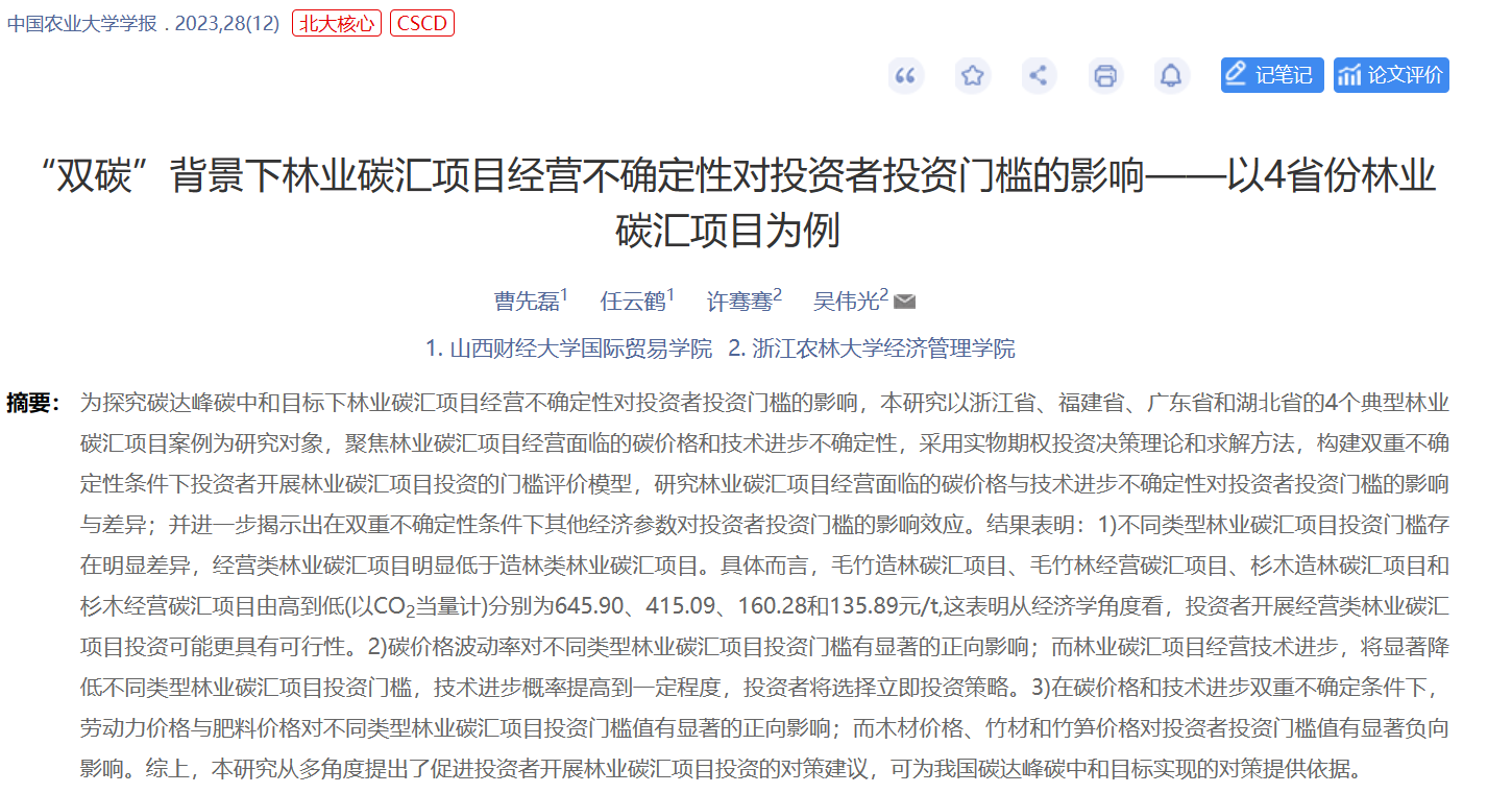 吴伟光教授团队研究成果在《中国农业大学学报》发表 近日,由公司吴伟光教授与山西财经大学曹先磊副教授等人合作撰写的学术论文《“双碳”背景下林业碳汇项目经营不确定性对投资者投资门槛的影响——以4省份林业碳汇项目为例》在《中国农业大学学报》2023年第12期发表;中国农业大学学报为公司A类期刊。吴伟光教授为通讯作者。为探究碳达峰碳中和目标下林业碳汇项目经营不确定性对投资者投资门槛的影响,该论文以浙江省、福建省、广东省和湖北省的4个典型林业碳汇项目案例为研究对...